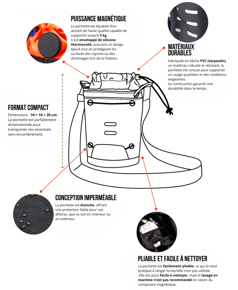 Fini le stress ! Fixez simplement votre pochette magnétique sur n’importe quelle surface métallique — l’aimant ultra-puissant maintient votre gourde et vos essentiels en toute sécurité, toujours à portée de main.